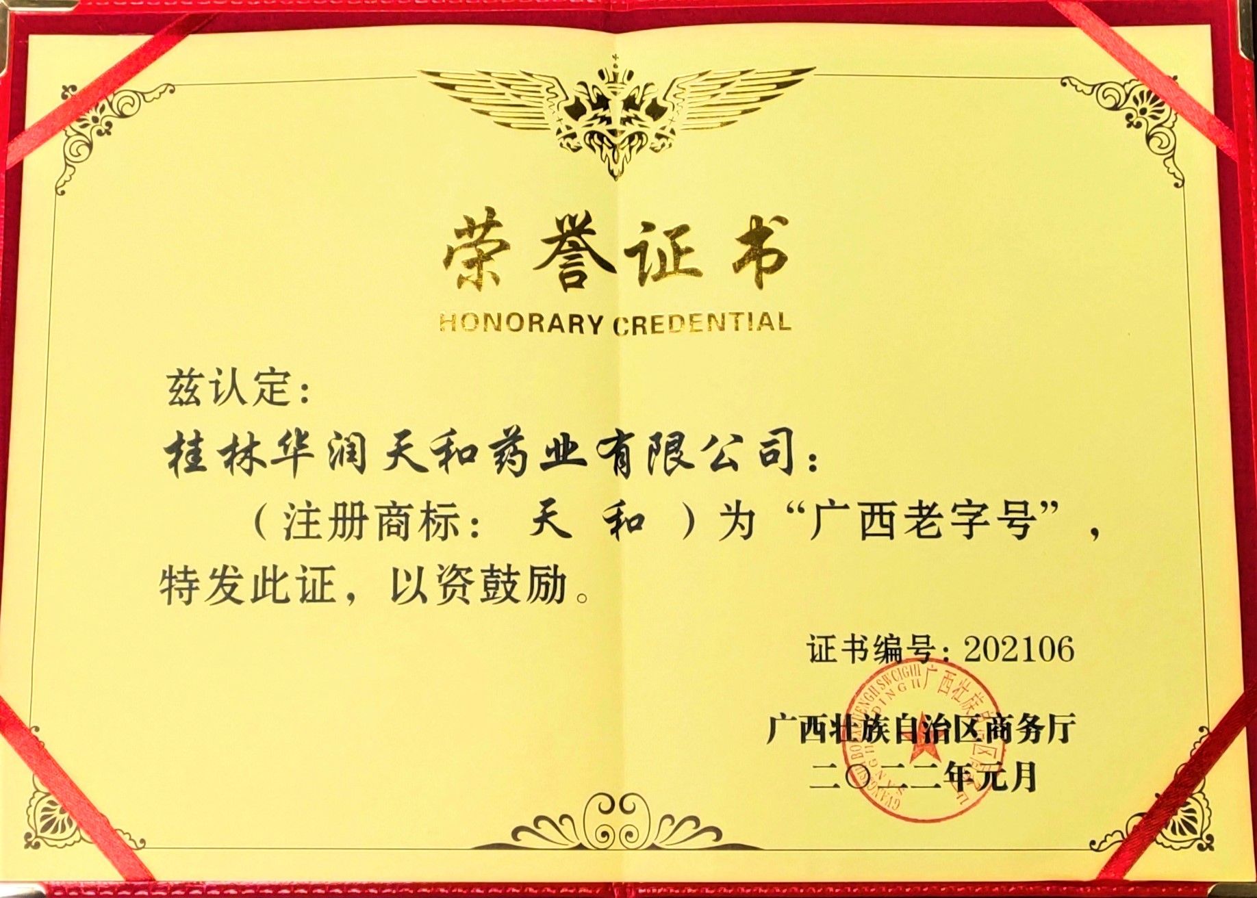4月15日,广西壮族自治区商务厅召开2022年全区老字号工作推进会议,会上为2021年入选“广西老字号”的13家企业颁发了荣誉证书和牌匾,华润天和喜获这一荣誉。