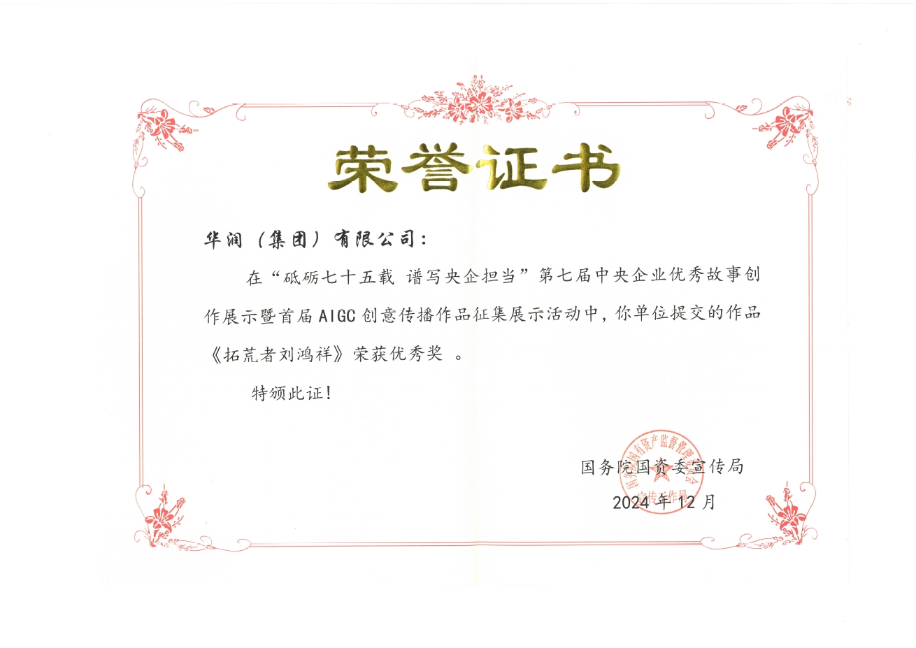 12月3日,第七届中央企业优秀故事暨首届AIGC创意传播作品发布展示活动在北京举行,主题为“砥砺奋进七十五载 谱写央企担当”。现场公布了优秀故事作品、AIGC优秀作品、优秀组织奖等多项荣誉,并举办了中央企业优秀作品的展演活动。中国·必威(bw·西汉姆联)中文官方网站(雅安)黄玉伟创作的精彩故事《拓荒者刘鸿祥》,在各中央企业报送的2600余件图文作品中脱颖而出,荣获优秀奖。