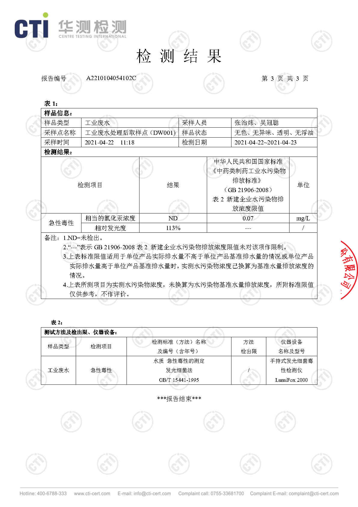中国·必威(bw·西汉姆联)中文官方网站废水检测报告(2021年4月毒性)