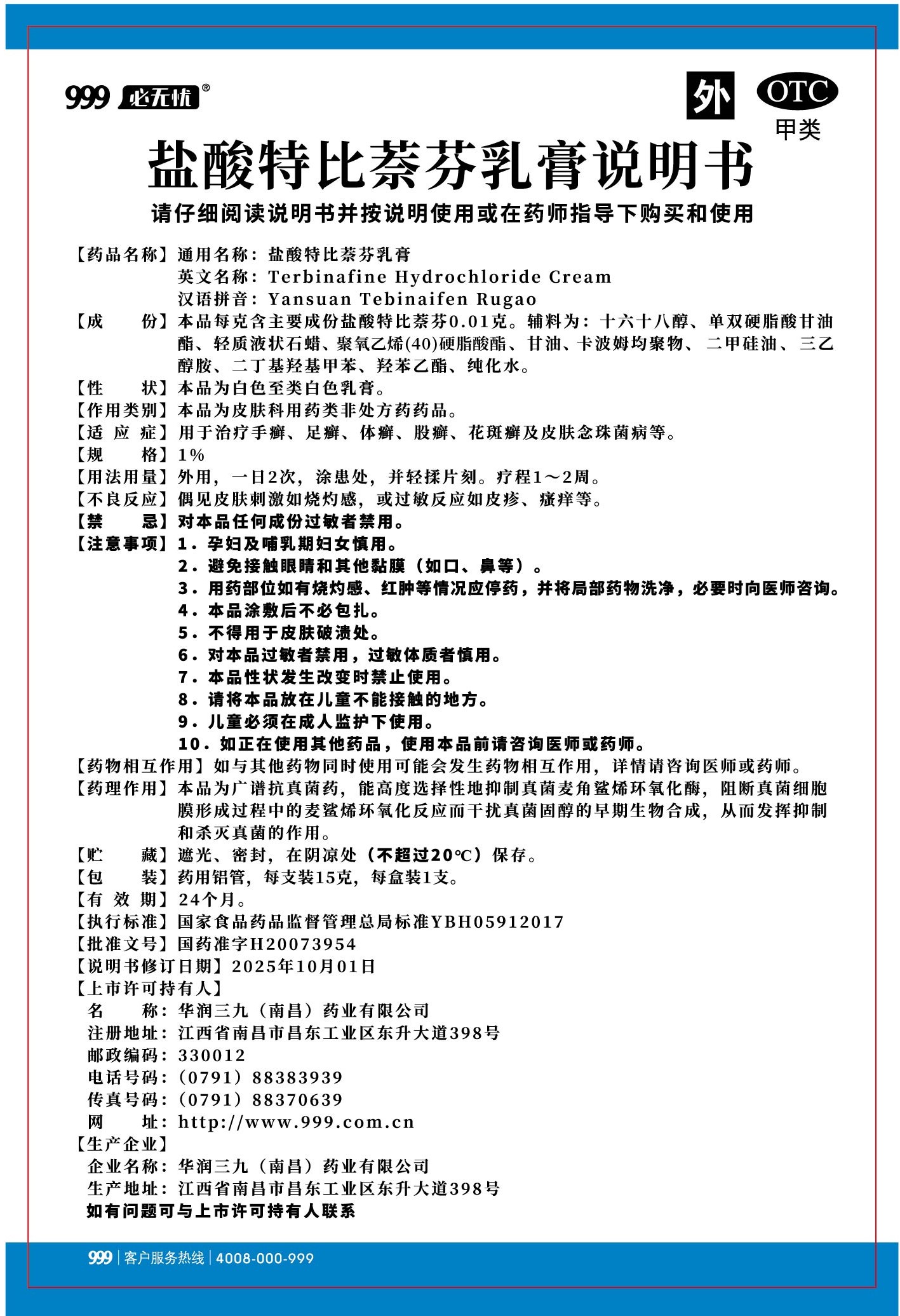 盐酸特比萘芬乳膏-南昌三九(铝管装)