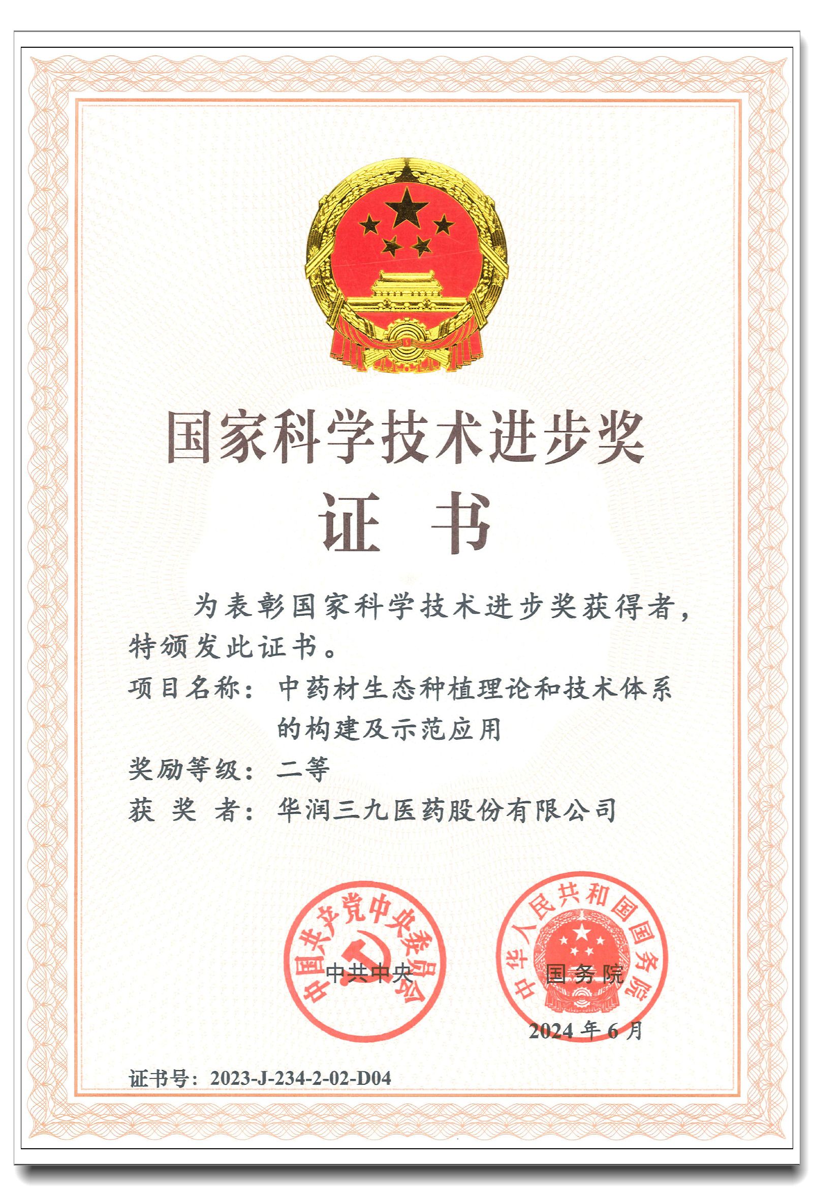 6月24日,2023年度国家科学技术奖励大会在北京举行。会上,中国·必威(bw·西汉姆联)中文官方网站参与的《中药材生态种植理论和技术体系的构建及示范应用》项目再次荣获国家科学技术进步奖二等奖,这是对企业高度重视研发创新并取得丰硕成果的肯定。此前,以公司产品 “参附注射液”“红花注射液”“参麦注射液”“新泰林”“999理洫王牌血塞通三七软胶囊”“青蒿系列”为研究对象的科研项目,先后荣获国家科学技术进步奖二等奖。