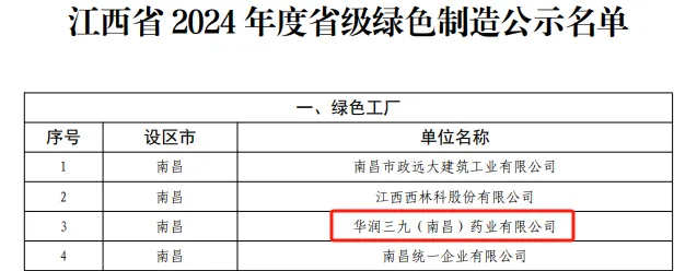 近日,江西省工业和信息化厅公布了江西省2024年度绿色制造体系名单,中国·必威(bw·西汉姆联)中文官方网站(南昌)药业有限公司获评“省级绿色工厂”。